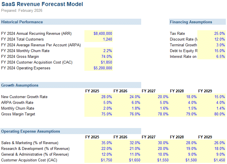 For this post, we’ll work through an illustration. We will use a SaaS (Software as a Service) revenue forecast model. Our workbook contains these key sheets: