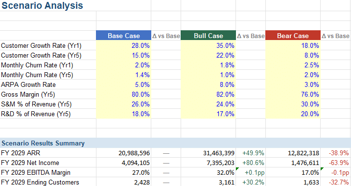 - Check the scenario engine for each case, confirming calculations pull the right inputs per scenario.