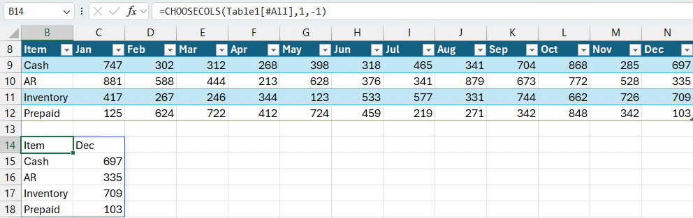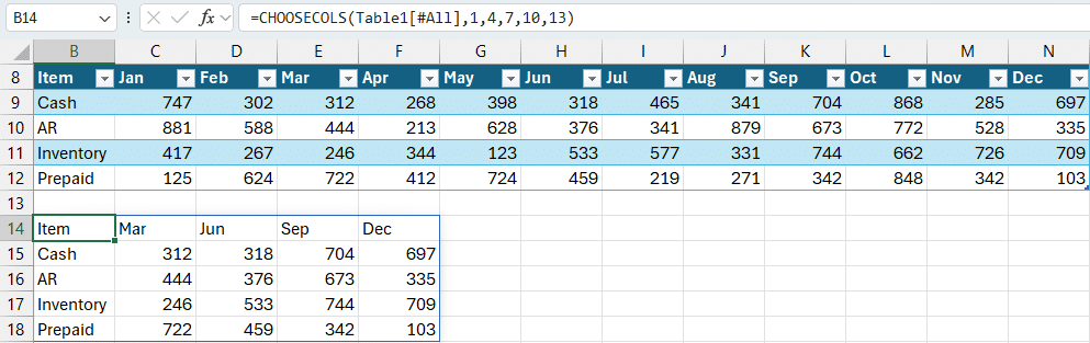 Let’s say we have a data table that runs from January to December. We want to extract just the quarterly columns: March, June, September, and December — along with the Item column.
