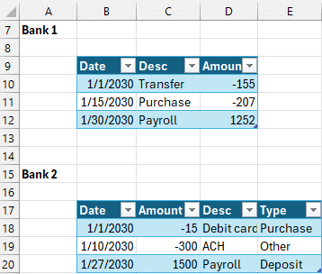 If we use VSTACK to combine data from multiple tables, we often face issues where the columns are in different orders. For instance, let’s say we want to combine the values in two bank downloads (each bank has their own column structure):