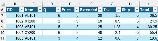 Suppose we want to filter for a specific item such as the value in cell B13 (currently “AB101”) and return only selected columns like Transaction ID, Quantity, Price, and Total: