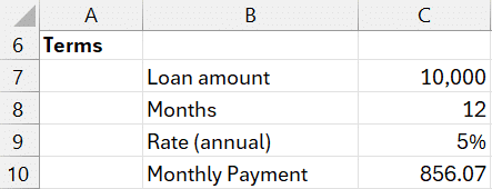 We calculate the monthly payment using the PMT function, which we won’t go into here (details in these PMT posts).