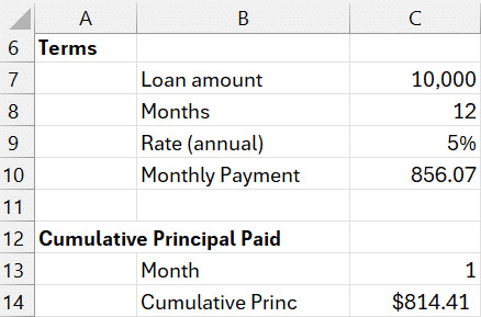 This spills values downward, giving us the cumulative principal paid at each point. Confirm accuracy by ensuring the final value equals the total principal (i.e., loan amount).