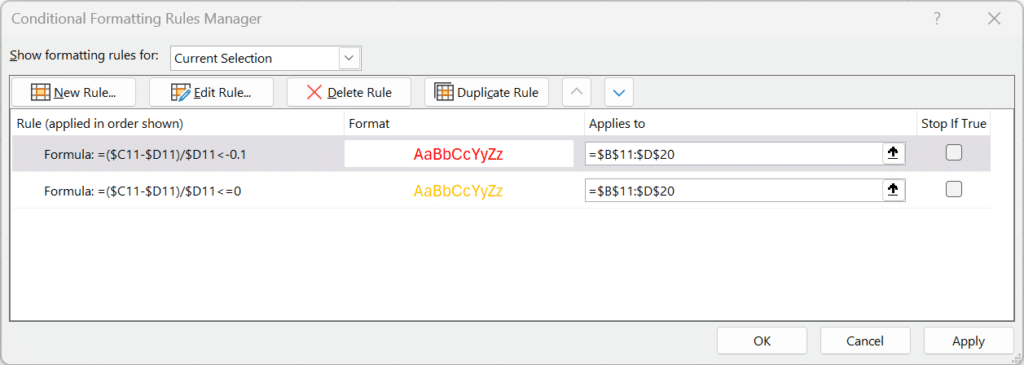 So, looking at the rules above, if the variance is less than -10% red is applied. The next rule will apply yellow font when the variance is less than 0. But, only to the cells that don’t meet the prior rule. You can re-order the rules to suit your situation by selecting the rule and using the up / down arrow buttons. You can also use the Stop if True checkbox depending on what you are working on. Plus, if the cell formatting elements are different in the rules, such as one doing font color and another doing cell fill, they will both be applied.