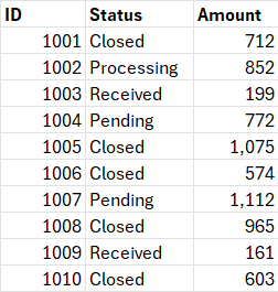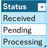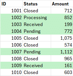And when the conditional formatting rule is applied, the transactions with a Status value found in the Status Table is highlighted, like this: