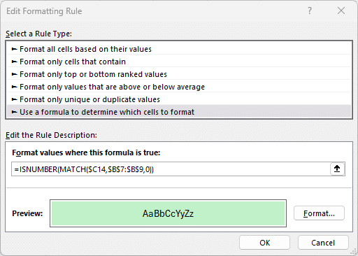 Note: if your version of Excel doesn’t support the ISNUMBER function, you can actually use the MATCH function alone in the conditional formatting rule in this case. For training purposes, I like to recommend formulas that return TRUE/FALSE whenever possible when using them as conditional formatting rules.