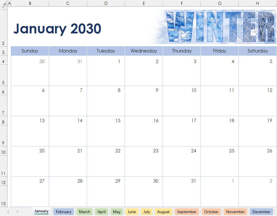 Once the template opens, you’ll see a workbook with a separate sheet for each month of the year.