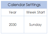 For example, if you set the year to 2030, all months will reflect that change instantly. This makes it easy to update the calendar each year with minimal effort.