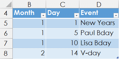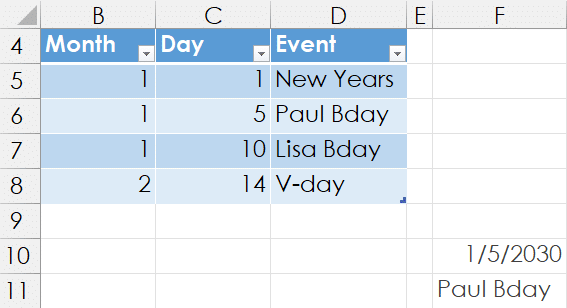 Now we need a formula that will check the month and day of the entered date and return the corresponding event/s from our table. If no events exists for that day, it should return an empty string (""