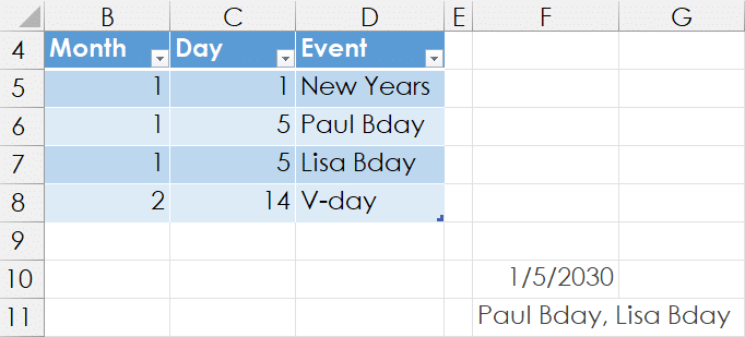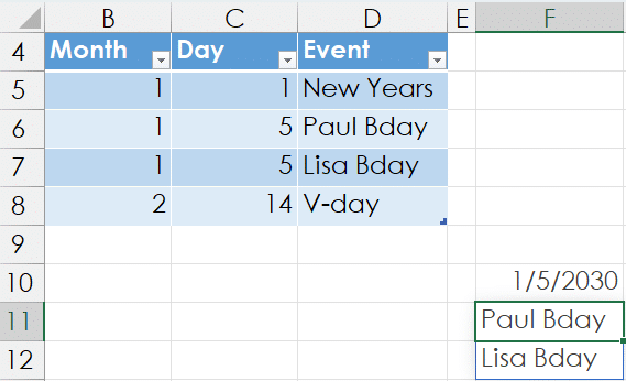 If multiple events fall on the same day, the formula will “spill” into multiple rows, like this: