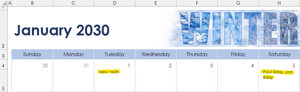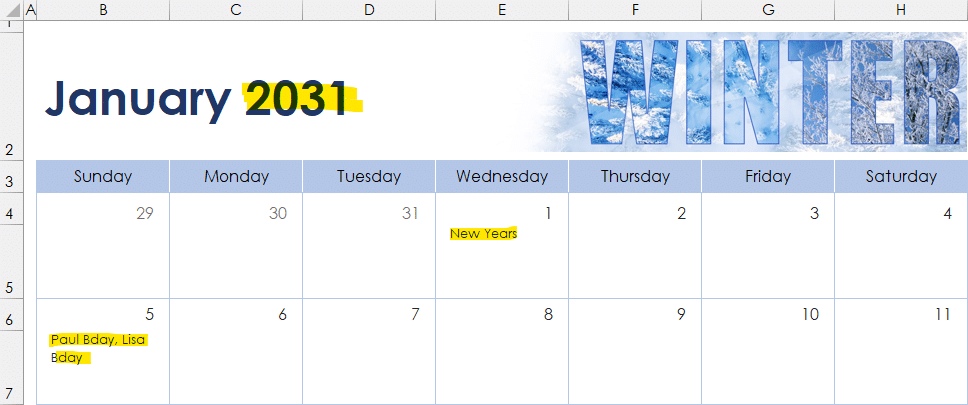 - Change the year in the January tab—your events should still appear on the correct dates, ensuring your calendar is reusable every year!