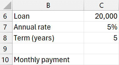 First, let’s use the PMT function to calculate a monthly loan payment in cell C10. Assume: