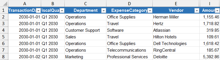 - Data: Contains transactional actual expenses (columns include date, department, expense category, vendor, payment method, amount, etc.).