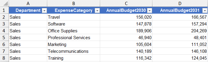 - Budget: Holds budget data per department and expense category, with annual budget columns for two years (e.g., 2030 and 2031).