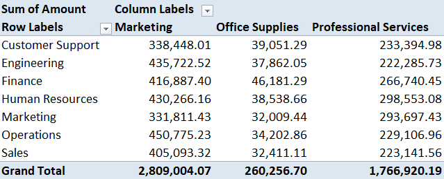 "Build a pivot-style summary showing total spending by department with columns for expense categories."