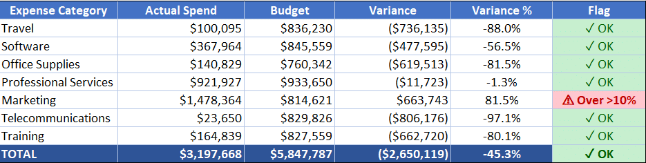 "Create a budget vs actual comparison by department. Add columns for budget, variance, and variance percent. Flag any category where actual spending exceeds budget by more than 10%."