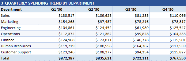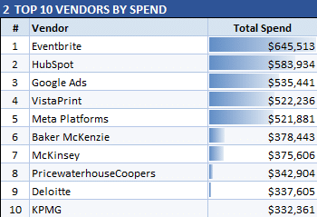 "Prepare a one-page management report that includes a department spending summary, top 10 vendors by total spend, quarterly spending trend by department, and a budget utilization summary formatted for executive review."