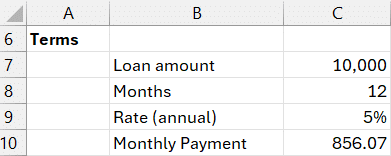 Then, let’s calculate the total monthly payment in C10 by using the PMT
