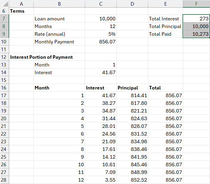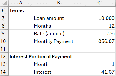 We can type different month numbers into C13 and instantly see the corresponding interest payment for that period.