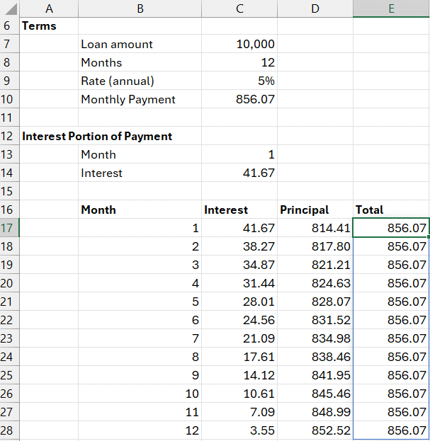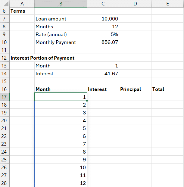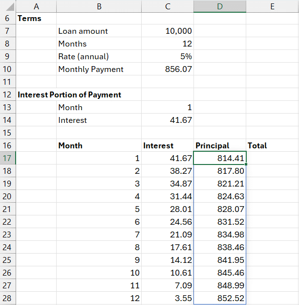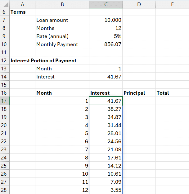 Still using our spilled ranges, let’s calculate the monthly principal now. We’ll subtract the total monthly payment from the interest for each month in D17:
