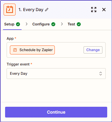 - Use Zapier’s built-in Schedule trigger to start the process each morning