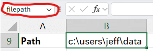 A: To store the path to your data folder in Excel, enter the path in a cell within your import destination workbook and then name the cell. For instance, you can name it ‘filepath’. To name a cell, select it, go to the Name Box, type in your preferred name, and press Enter.