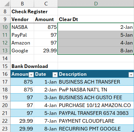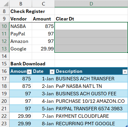 Now let’s reconcile a check register with a bank download. In this example, we need to match transactions by both amount and vendor, but the descriptions in the two lists aren’t identical. Specifically, we’d like to write a formula in D10:D13 that will retrieve the date from the bank download where the Amount is equal to the Amount and where the Vendor name is found anywhere within the Description.