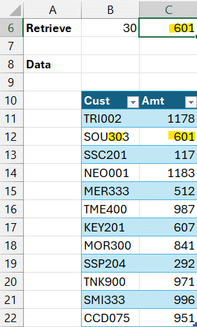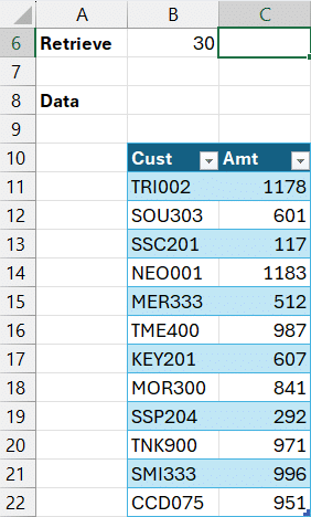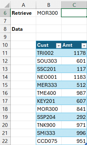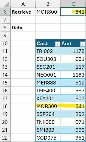 =XLOOKUP(B6, Table1[Cust], Table1[Amt])
