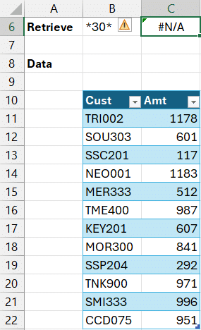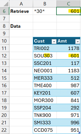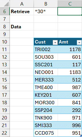 =XLOOKUP(B6, Table1[Cust], Table1[Amt], , 2)