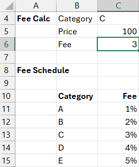 Then, based on the category chosen, we can retrieve the correct fee percentage from this lookup table. So, how can we do that? Well, that leads us to the next exercise.
