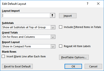 If you already have a PivotTable with the layout options you’d like to use for the default, then you can select it and click the Import button. Otherwise, you can simply select your desired default layout options.