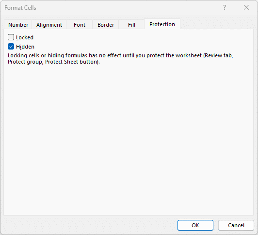 - Within the “Protection” tab, you will see two checkboxes: locked and hidden. Check the “hidden” checkbox.