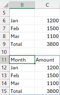 {"Month","Amount"}is a manually typed array with two text valuesB6:C9contains the actual data- VSTACK puts the custom headers on top of the data
